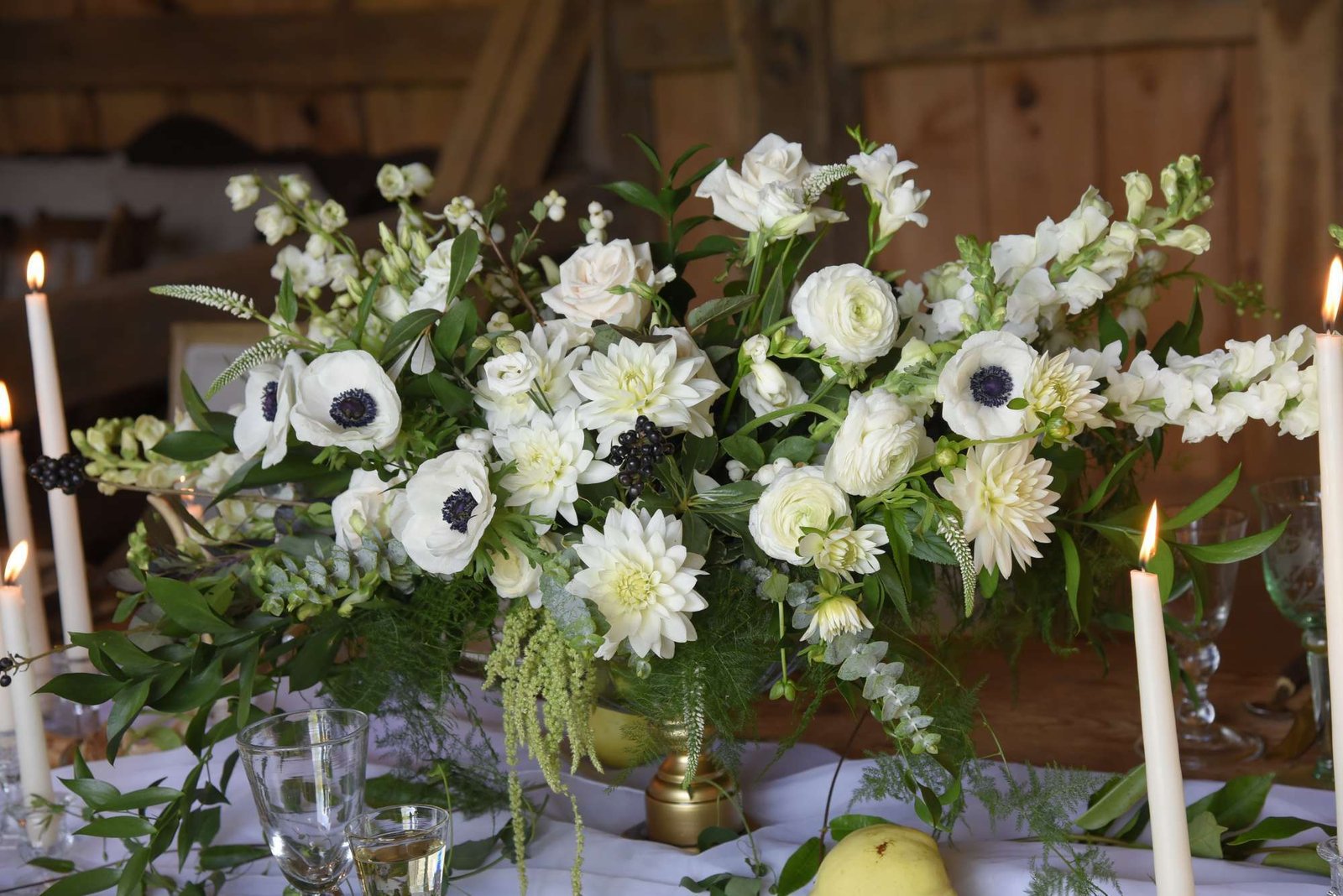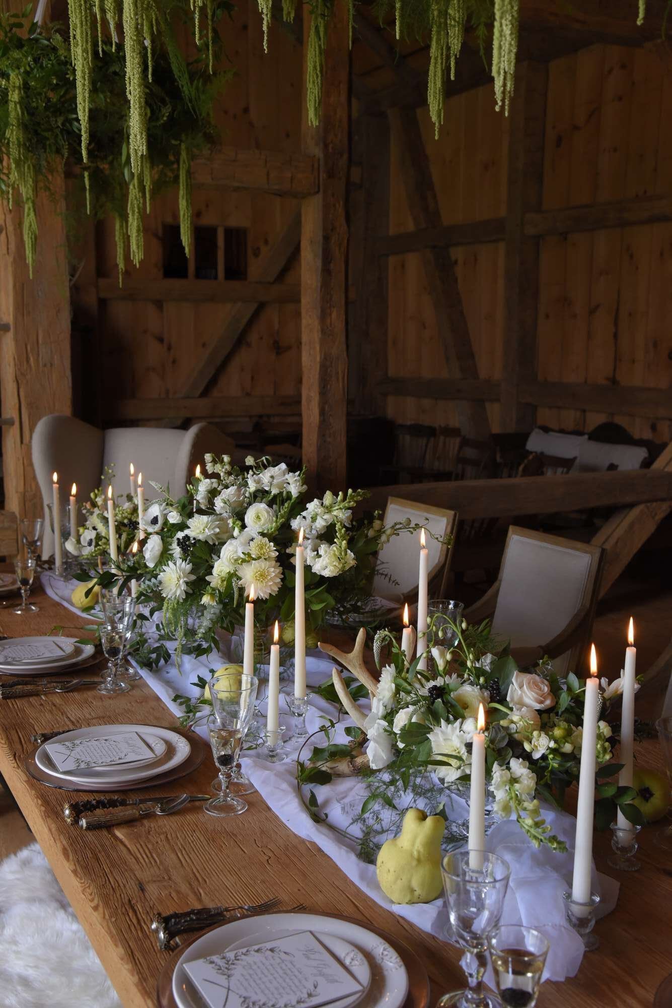 Enchanted Wedding Theme Venue: Chandler Oaks Barn | Photographer: Breathless Imagery Table Scape by Window: Décor – In Good Company | Flowers – In Good ...