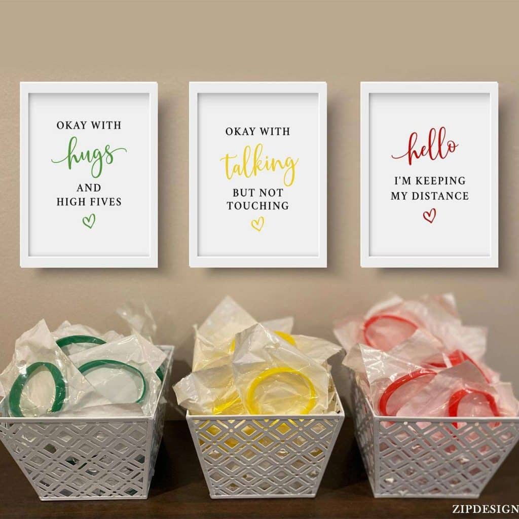 Just how comfortable are your guests with attending a wedding during a pandemic? There’s an easy way to help them speak their truth: Set out a series of ribbons or colored bracelets and invite each guest to wear one to indicate their comfort level. Green means they are happy to hug and shake hands, yellow means they are cool with chatting but not touching, and red means they prefer to keep a 6-ft distance. Symbolic colors are an easy way for folks to be honest about their feelings.
